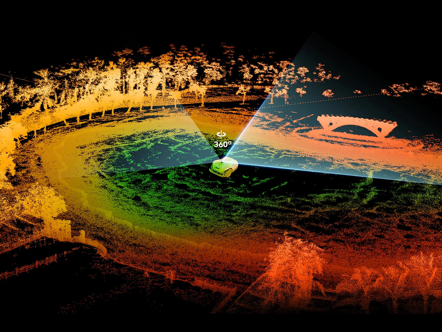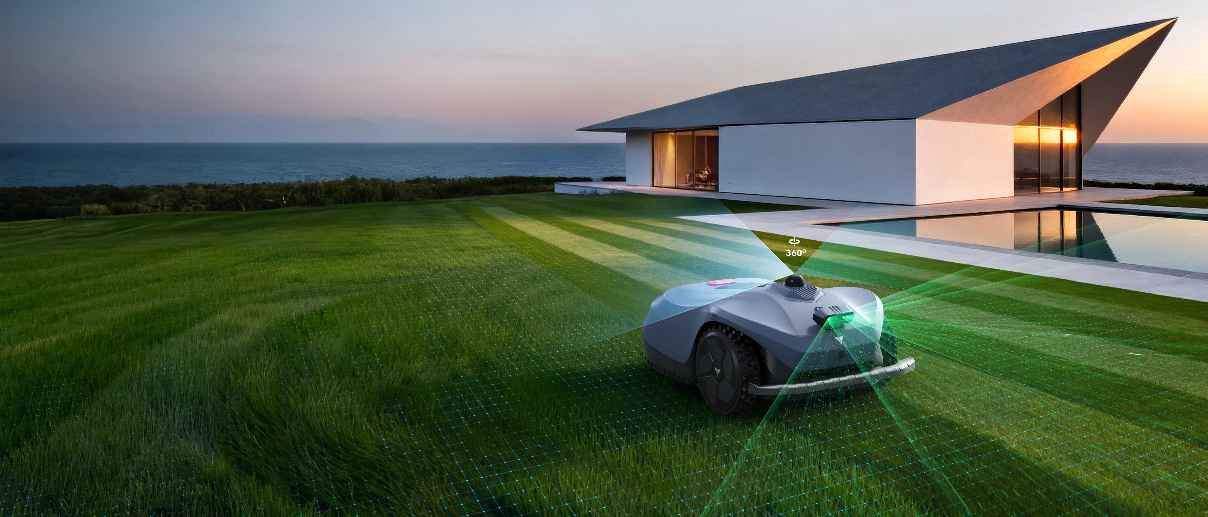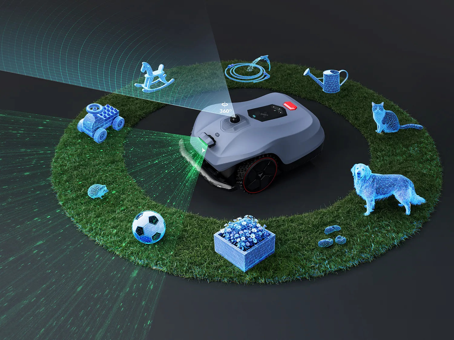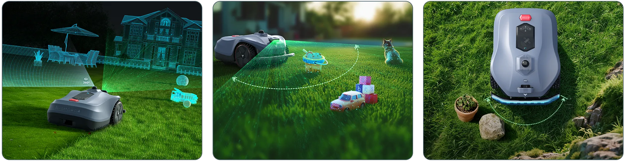 3D LiDAR scans a full 360° around the mower to map the environment with centimeter-level precision, Triple Camera vision identifies what those obstacles actually are in real-time, and a 110° physical bumper provides hands-on collision protection.